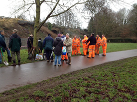 After numerous complications, this finally came to fruition on the 9th and 10th of January. 33 people turned out on the 9th of January, including orange clad volunteers from Network Rail who had provided around 250 shrubs and trees to go in front of the fence. It was a rotten day and the plants had not arrived, nevertheless all the holes were dug in record time. Despite further hiccups, the delivery finally arrived the following afternoon and more volunteers worked on into the evening mist until the job was completed.